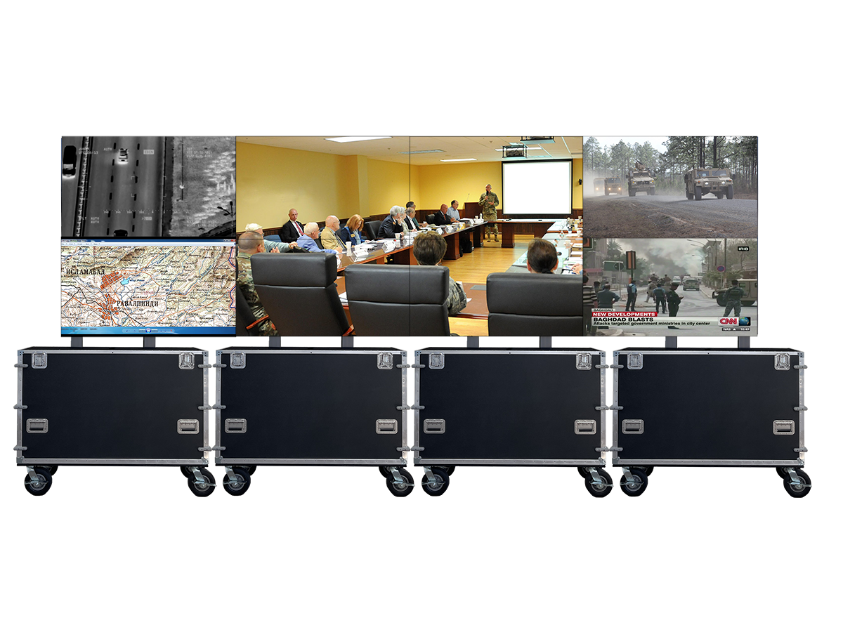 Video Walls offer ultimate display functionality for mobile command and control applications. By linking together four 2x1 Power Lift Displays users can achieve a single image dimension of up to 200”, or map multiple inputs to individual displays.